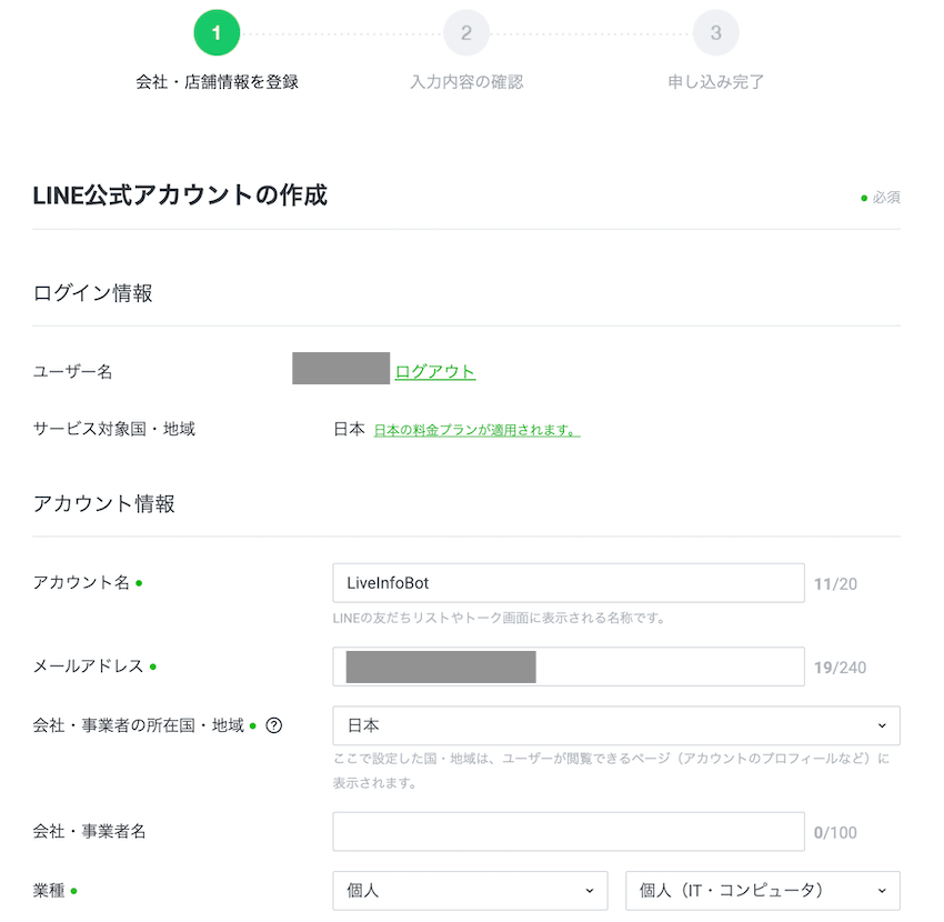 - アカウント名(Bot の名前)など必要な項目を入力して「作成」