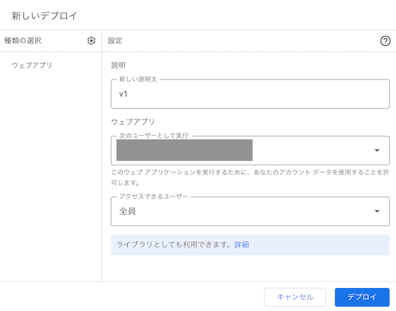 アクセスユーザーを「全員」に設定することで、誰でもアクセスできるようにする。ただし、誰でも実行するわけではないので、実行するユーザーは「自分(メアド)」に設定する