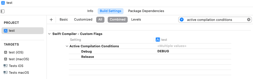 Xcode Project の Build Setting で Active compilation conditions の設定を利用します。デフォルトでは下記のようになっているかと思います。