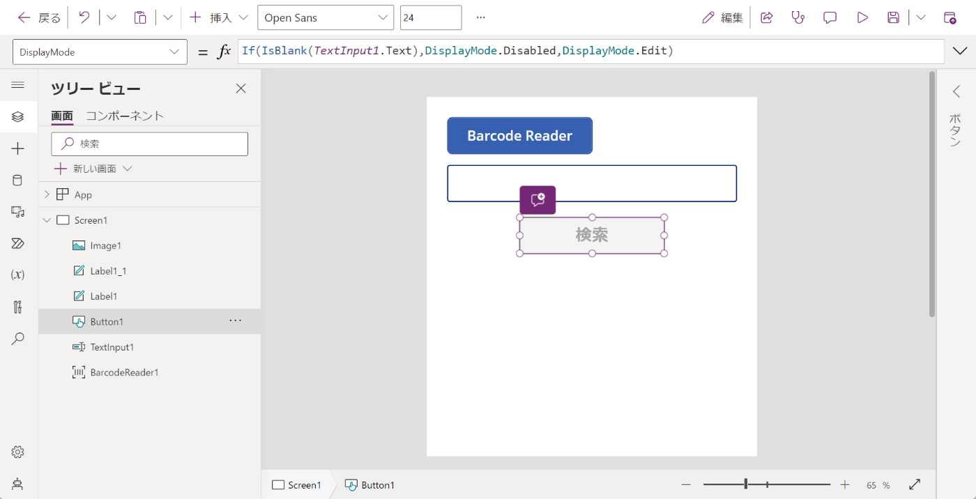 ついでに、TextInput1に文字が入っていないときは検索ボタンを押せないようにしておきます。