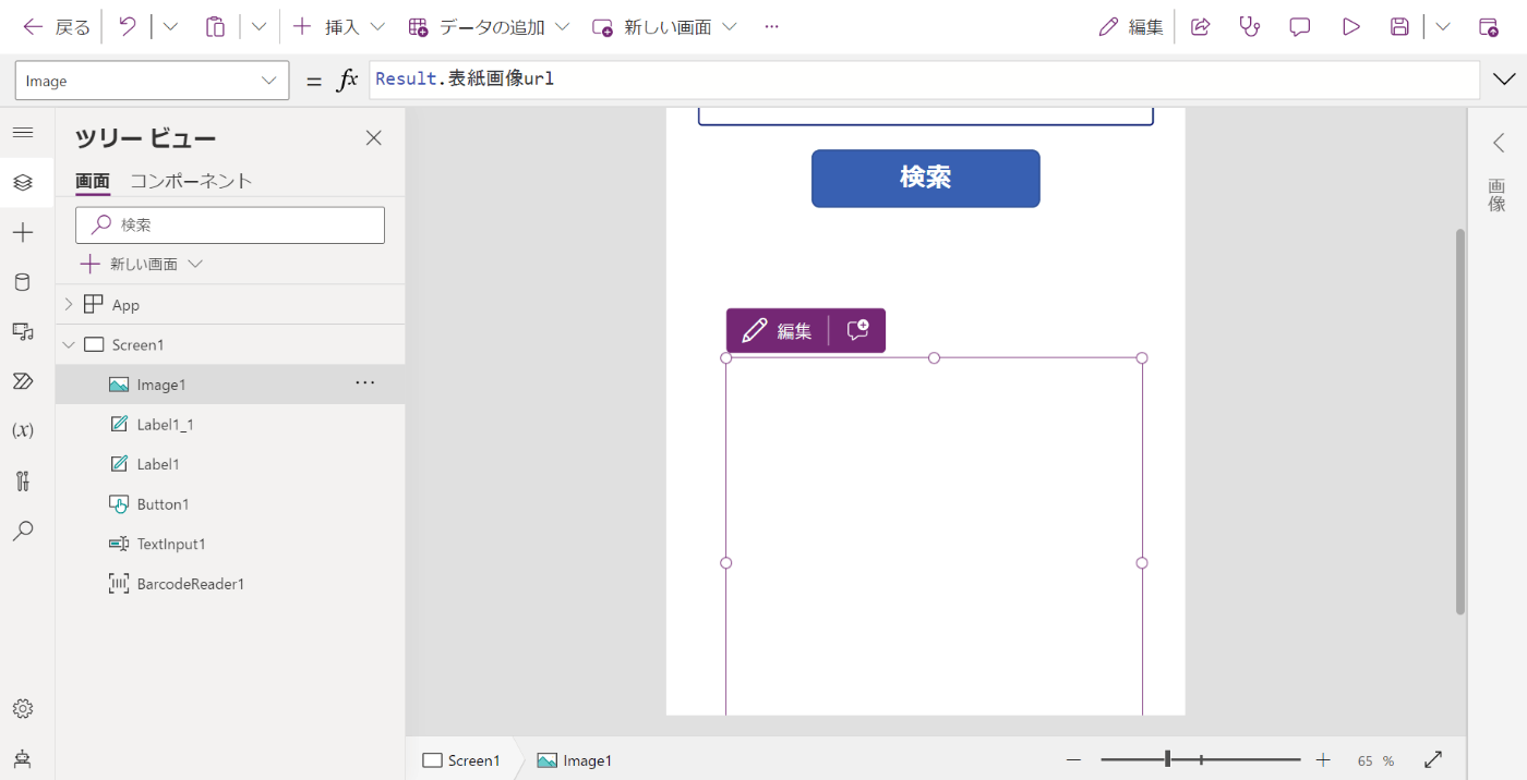 最後にその下に画像コンポーネントを置き、Imageプロパティを Result.表紙画像url にします。