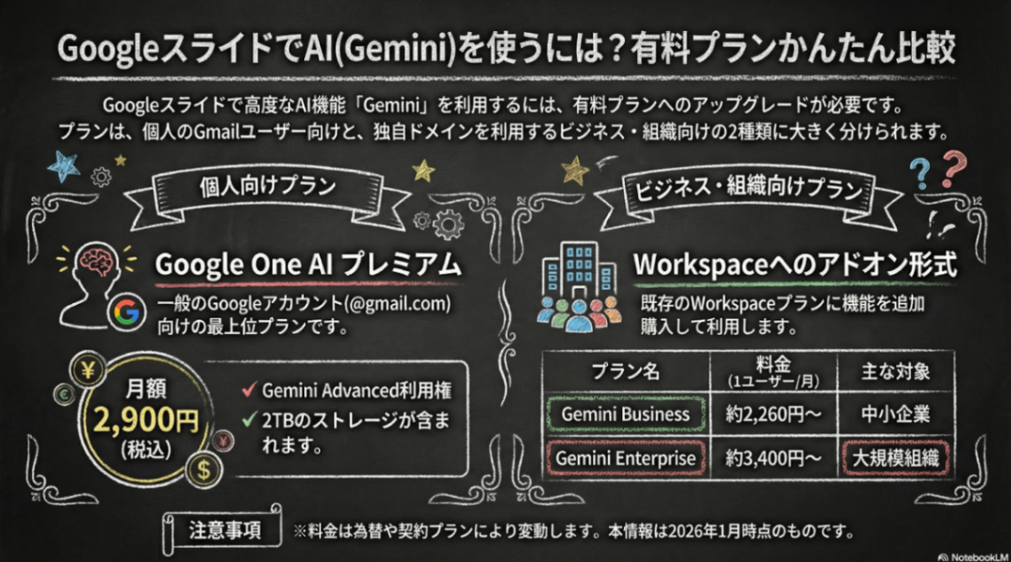 ※Googleスライド内でGeminiを使用するには、以下のいずれかの契約が必要です(2026年1月時点)。