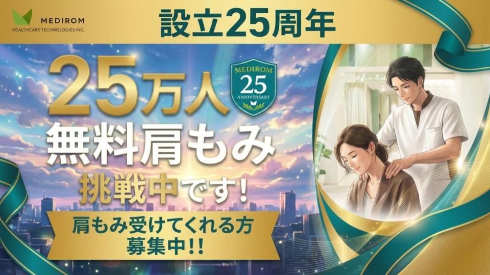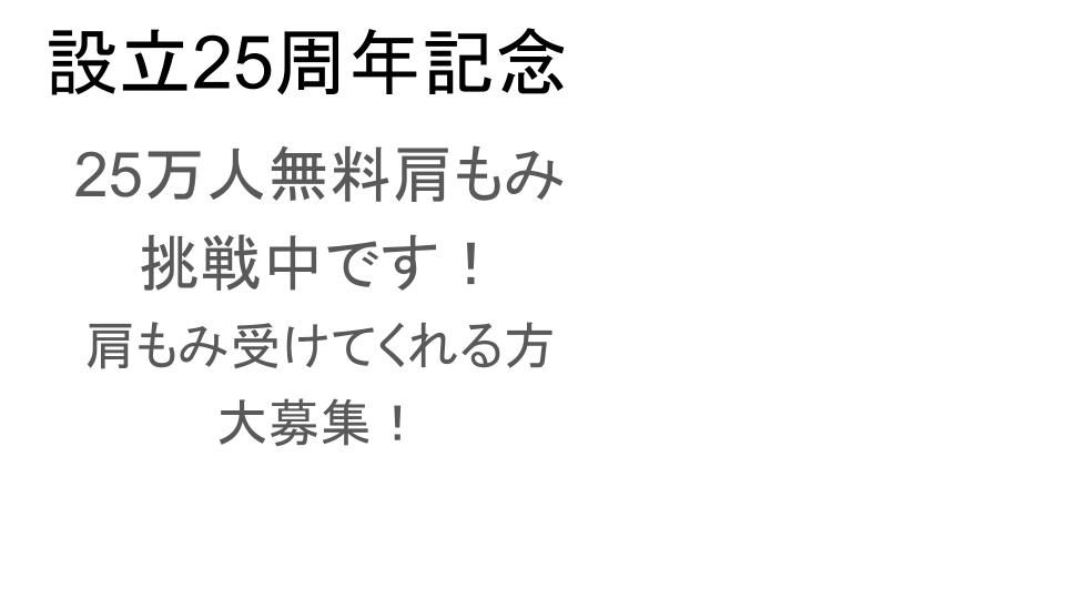 弊社(メディロム)は25周年を迎え、現在 「25万人無料肩もみ」 というキャンペーンに挑戦中です(宣伝)。 このキャンペーンの紹介スライドを作りたい場合、HPのスクショを使います。