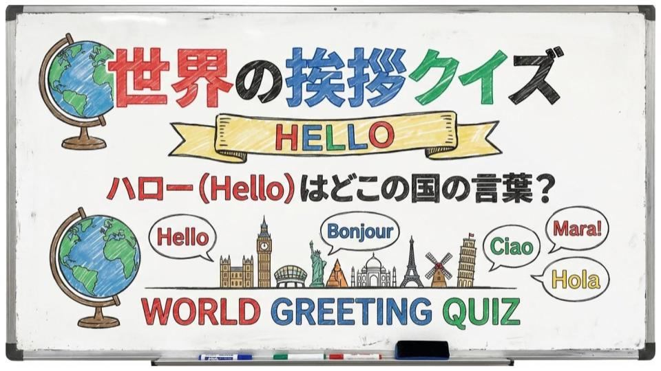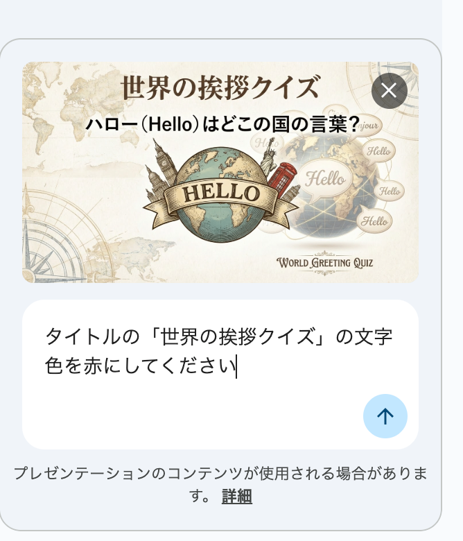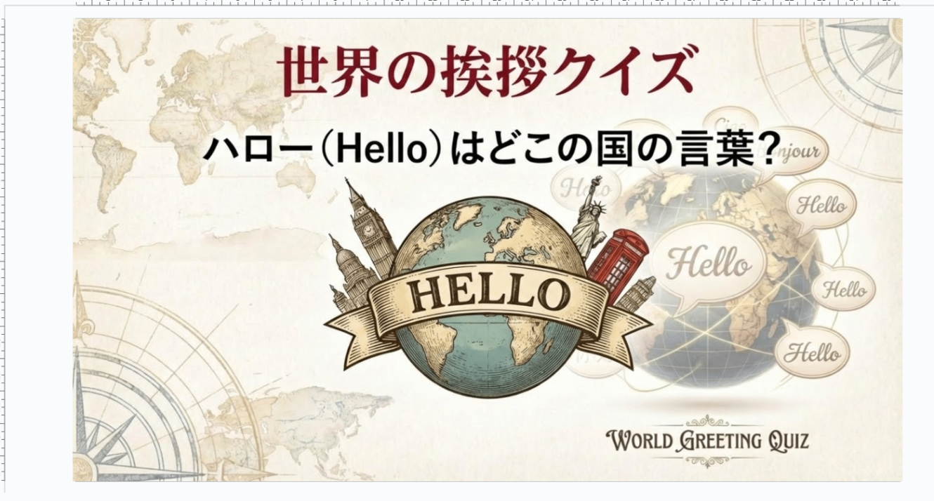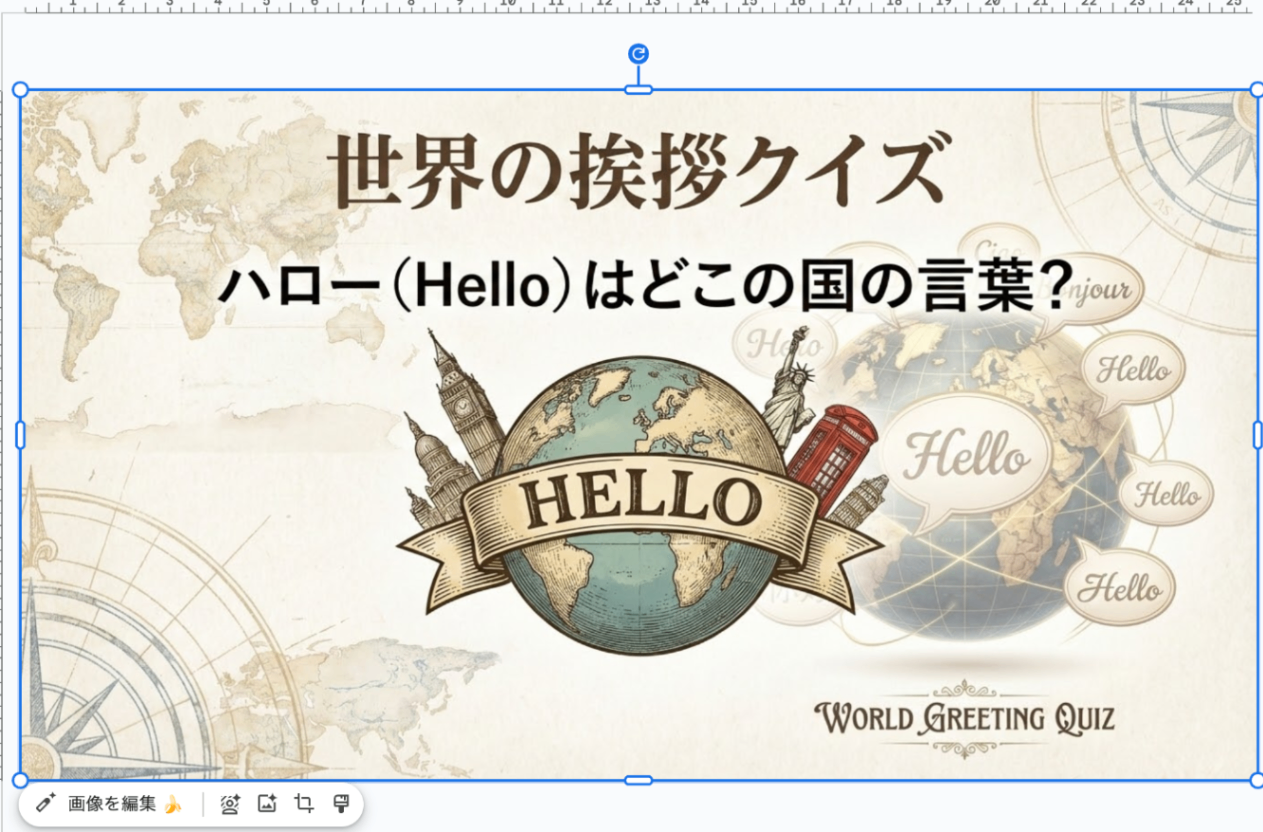 今回は例として「世界の挨拶クイズ」というスライドを作ってみます。