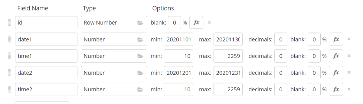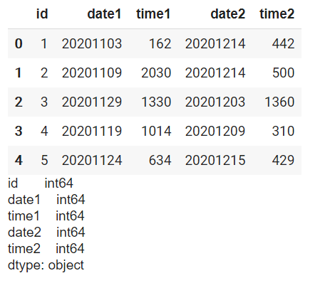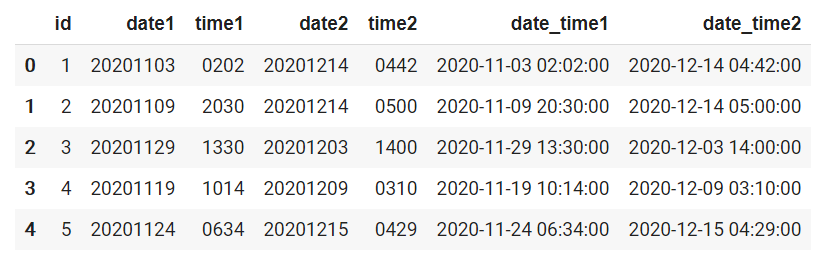 また、このcsv は、date1 カラムに年月日、time1 カラムに時分データが入っています(date2、time2 も同様)。