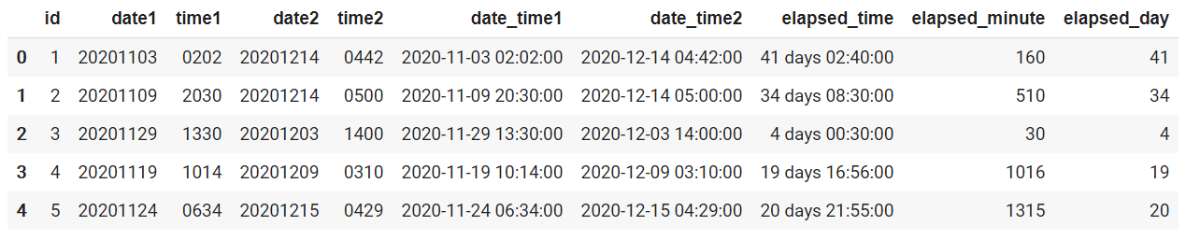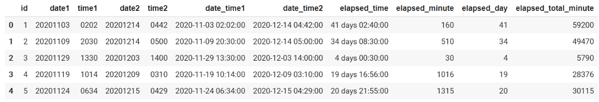 ただし上記の処理では、例えば 24日と5時間の差があった場合、df["elapsed_minute"] には 5時間部分が、df["elapsed_day"] には 24日間部分が、と別々に処理されてしまいます。