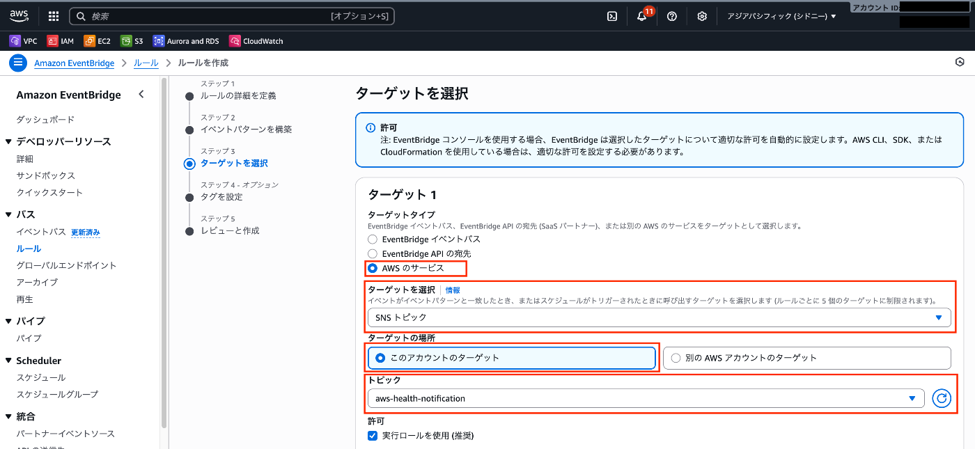 | Amazon EventBridge | Health Event を検知しSNSへ転送 |