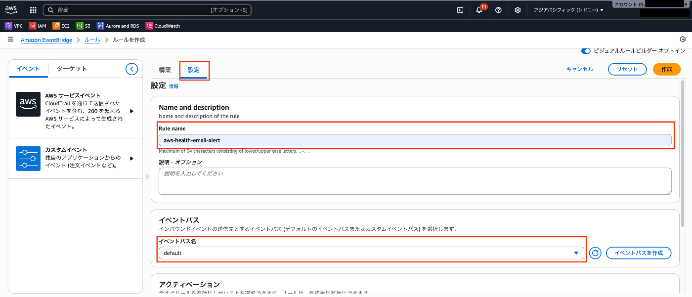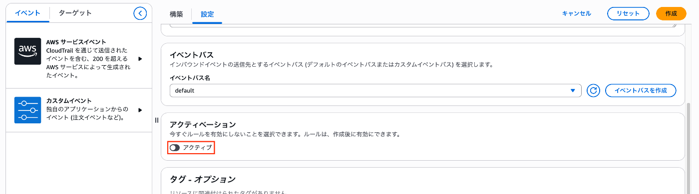 画面右上の「作成」をクリックして、EventBridge ルールを登録します