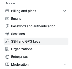 次に GitHub に行き、自分のプロフィール写真をクリック→ Settings → サイドバーの SSH and GPG keys に行ってください。
