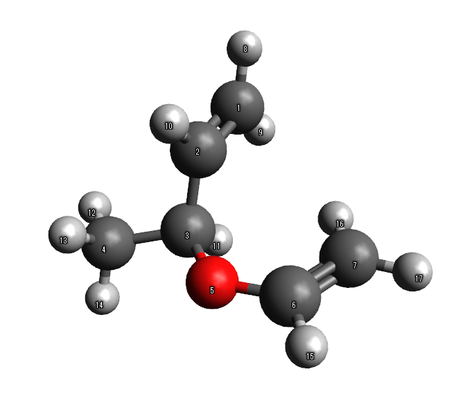 さて、NEB計算では原子同士の対応が重要です。有機化学から量子化学計算に入ると、油断すると水素の扱いが雑になるのですが、ここを間違えると無茶な結合の組み換えや回転が起こることとなってしまい、計算に失敗してしまいます。一応各原子がどういうラベルがついているかを見ておきます。