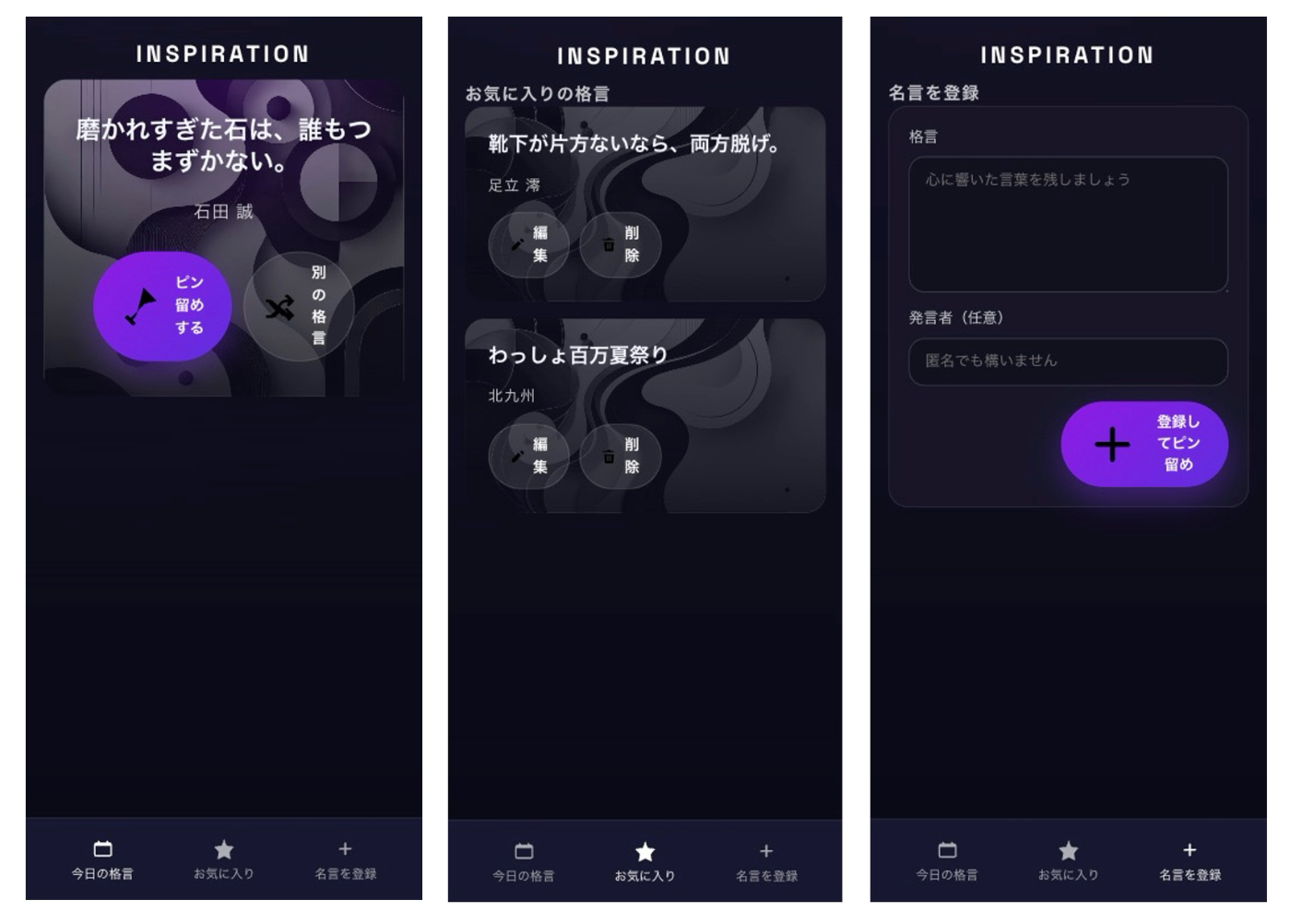 主な画面は「今日の格言」「お気に入りの格言」「名言を登録」の3つで構成され、localStorageによるデータ永続化や、ランダム背景画像の適用など、モダンなUI/UXを実現しています。