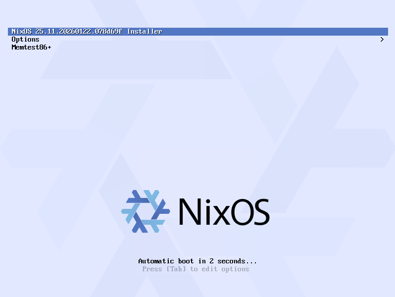 起動するとNixOSをインストールする際に出るGUIが一瞬表示され、