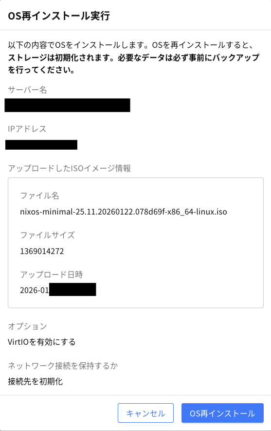 うまくアップロードできたら、内容確認→OS再インストールから電源を付けます。するとコンソール起動を促すポップアップが出るので起動します。ちなみに、ストレージが初期化すると書かれていても、実際にはisoが起動されるだけでストレージはそのままです。