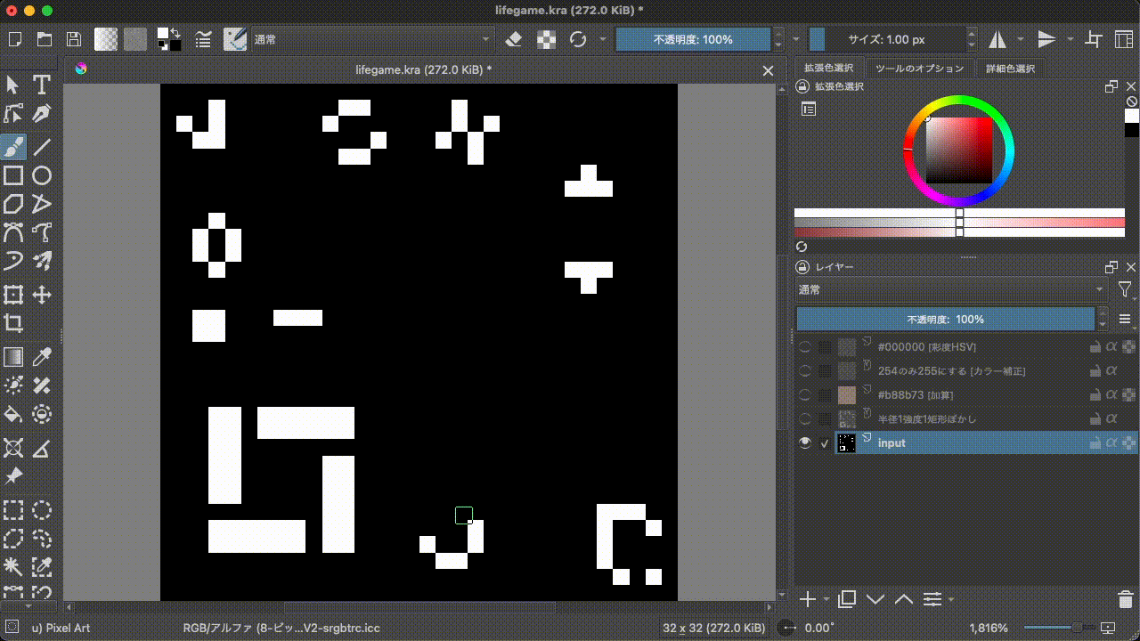 これはKritaという無料のペイントツールですが、Conwayのライフゲームが動作しています。