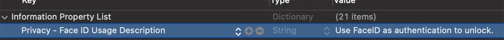 Xcode上では、「Privacy - Face ID Usage Description」と表示されています。