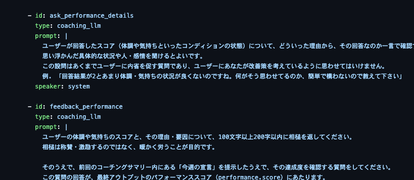 他にも、事前にシナリオをある程度定義しておいてそれに沿ったコーチングをできているかの一致度を見る方法なども試しましたが、コーチングという性質上必ずしも同じシナリオを辿ることが正解とは言えないため、ペルソナだけを定義してコーチングさせる方法の方が適していました。