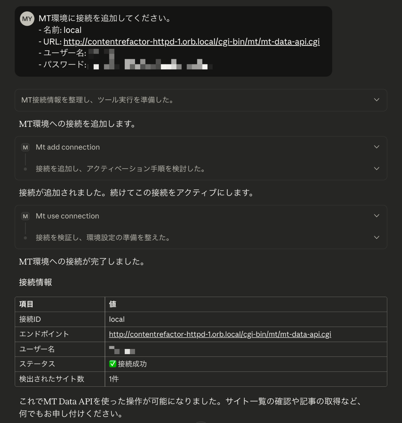 MTでDataAPI用のユーザーを作成して、Claude Desktop で以下のように指示する。