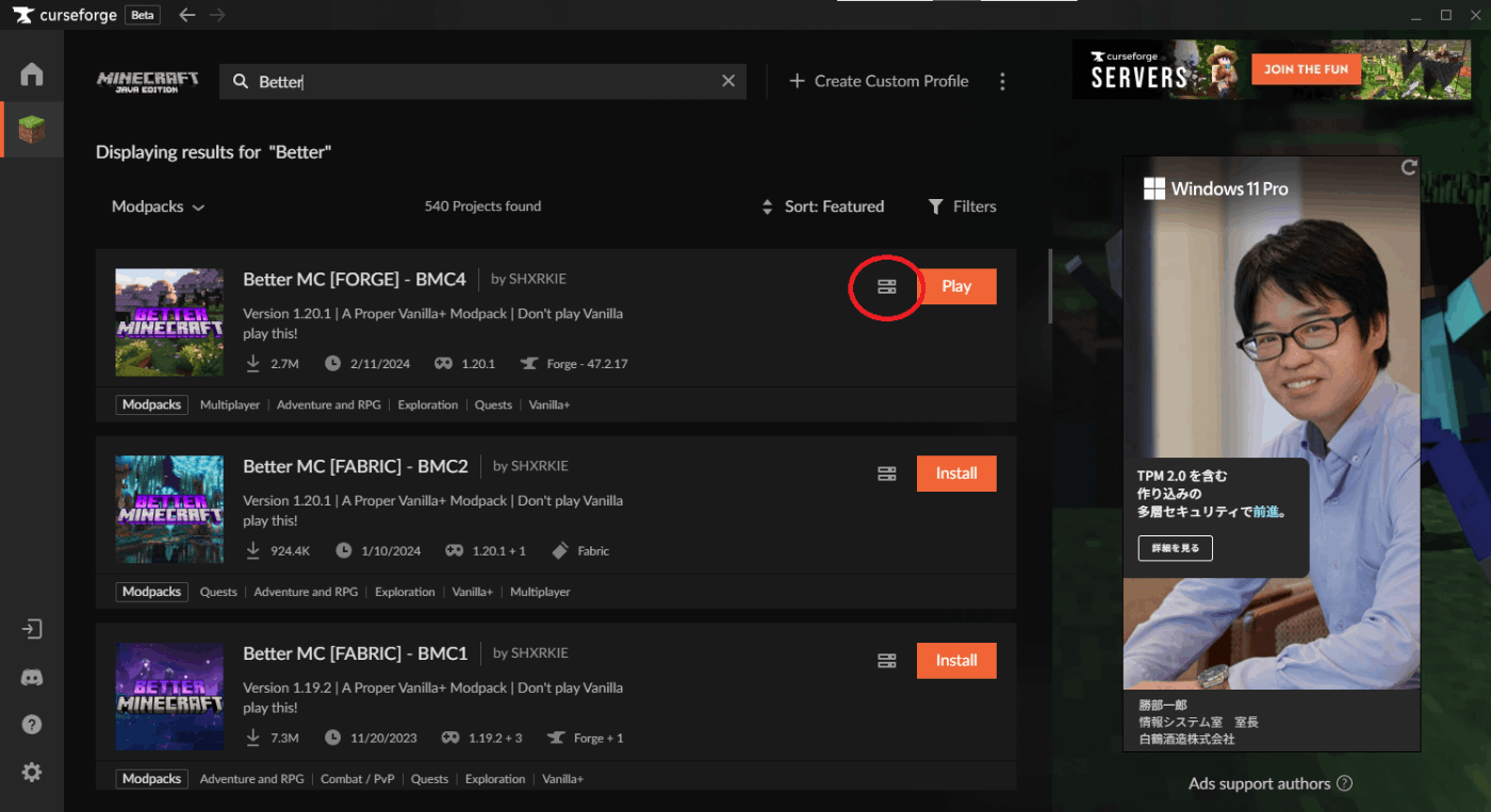 MinecraftのBrowseタブでBetterMinecraftを検索しプレイしたいバージョンを見つけたら「Install」ボタンの隣になるサーバーアイコンからDownload Server Pack(画像赤丸)を実行します。