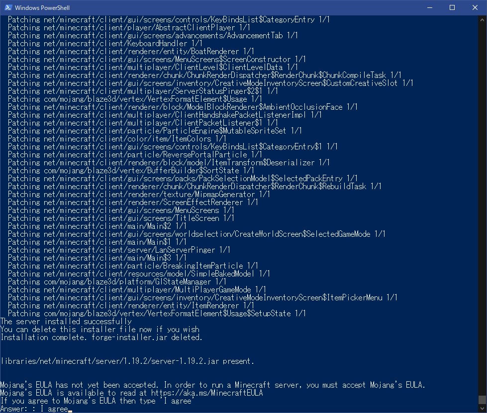 初回起動時は数分待っているとスクリプトが止まりマイクラサーバーお決まりのEULA規則について聞かれますので