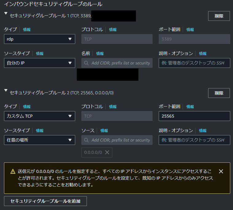 1.タイプ:rdp ポート範囲:3389 ソースタイプ:自分のIP