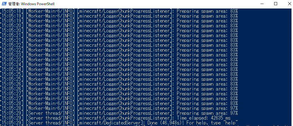 ワールドの生成率が100%になり「Done!」と表示されたらサーバーの立ち上げ成功です。
