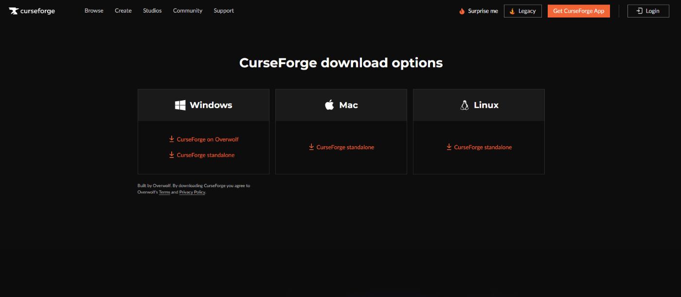 Curseforge公式サイトよりCurseforgeをダウンロードします。