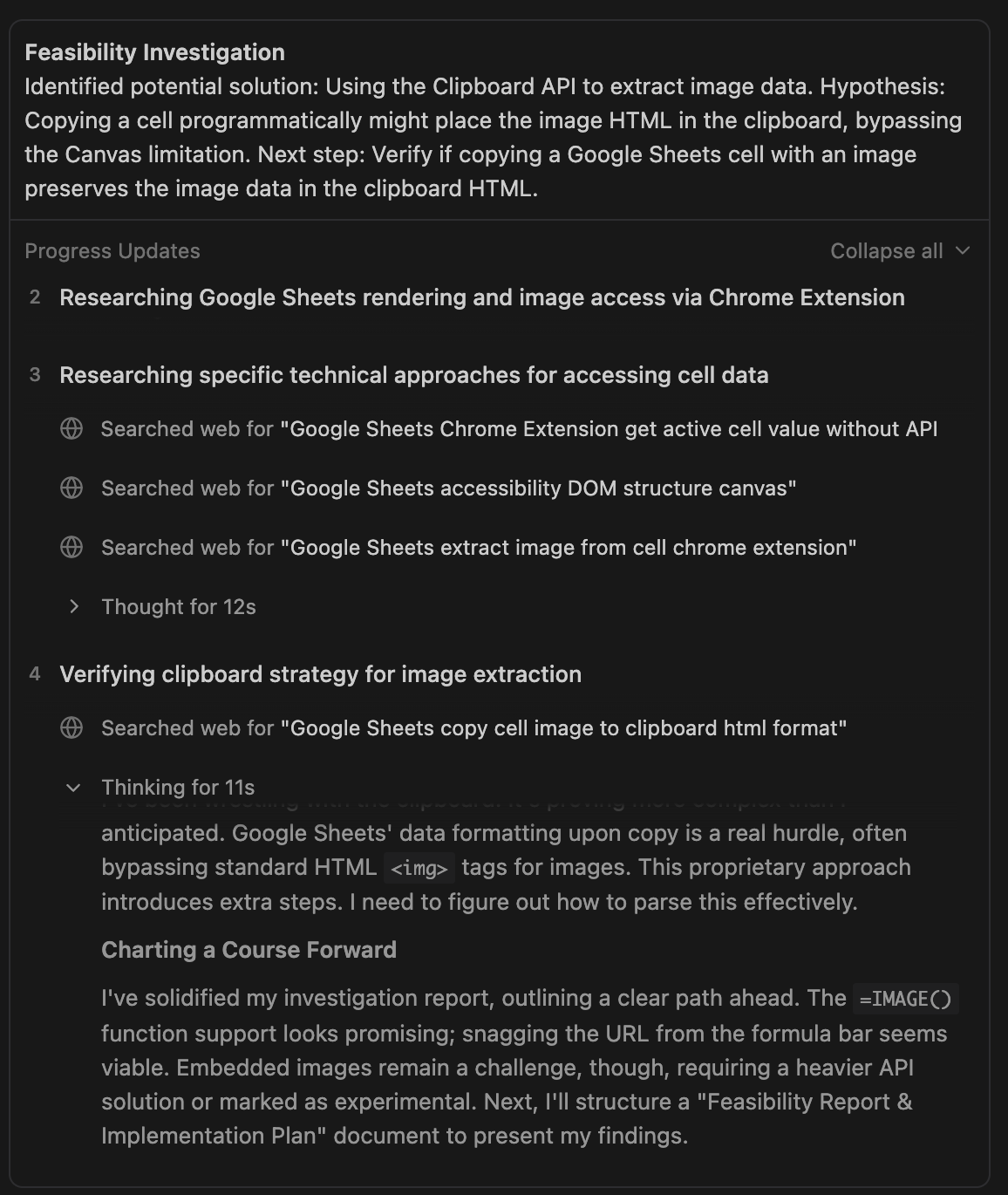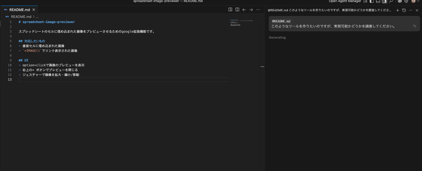 インポートすると、開いているスプレッドシートを自動操作して調査と再実装が進みます。