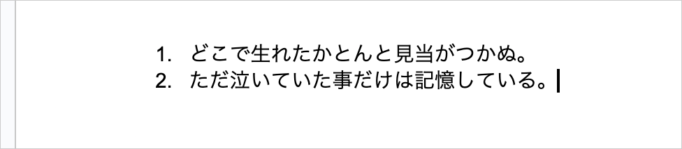 body.appendListItem("どこで生れたかとんと見当がつかぬ。").setGlyphType(DocumentApp.GlyphType.NUMBER);