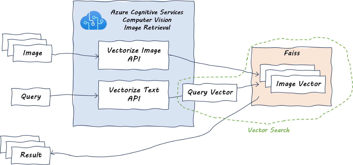 クエリと検索対象の両方に対して Vectorize Image API を使うことで、画像による画像検索 (類似画像検索) を行うこともできます。(下図のイメージ)