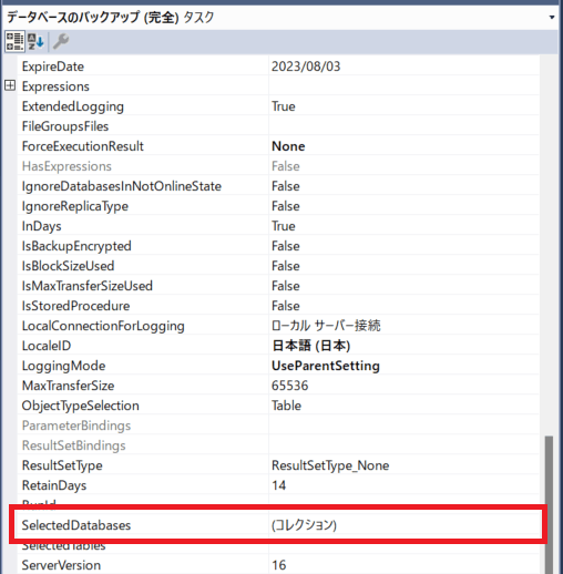 ということで、対応としてはパッケージ内に保持してるデータベース名を削除することになります。SSMS から、対象のメンテナンスプランをデザイナーで表示します。データベースを選択しているタスクを選びます。プロパティを表示し、SelectedDatabases を選択して、[...] ボタンを押します。