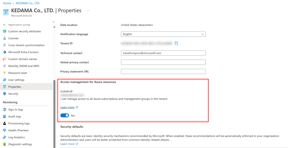 Root の範囲で権限を設定するには、Microsoft Entra ID ロールのグローバル管理者の権限を昇格させて操作する必要があります。全体管理者として Azure portal にログインし、[Microsoft Entra ID] > [Properties] > [Access management for Azure resources] でトグルを Yes に変更します。