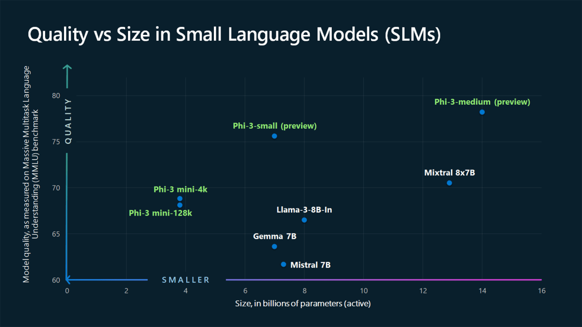 そんな中、Microsoftは、2024年4月にオープンソースのSLMである「Phi-3」を公開しました。Phi-3 モデルは、高性能でコスト効率に優れた、SLMで、さまざまな言語、推論、コーディング、数学のベンチマークで、同サイズのモデルよりも優れたパフォーマンスを発揮しています。詳しくは「Tiny but mighty: The Phi-3 small language models with big potential」を参照してください。