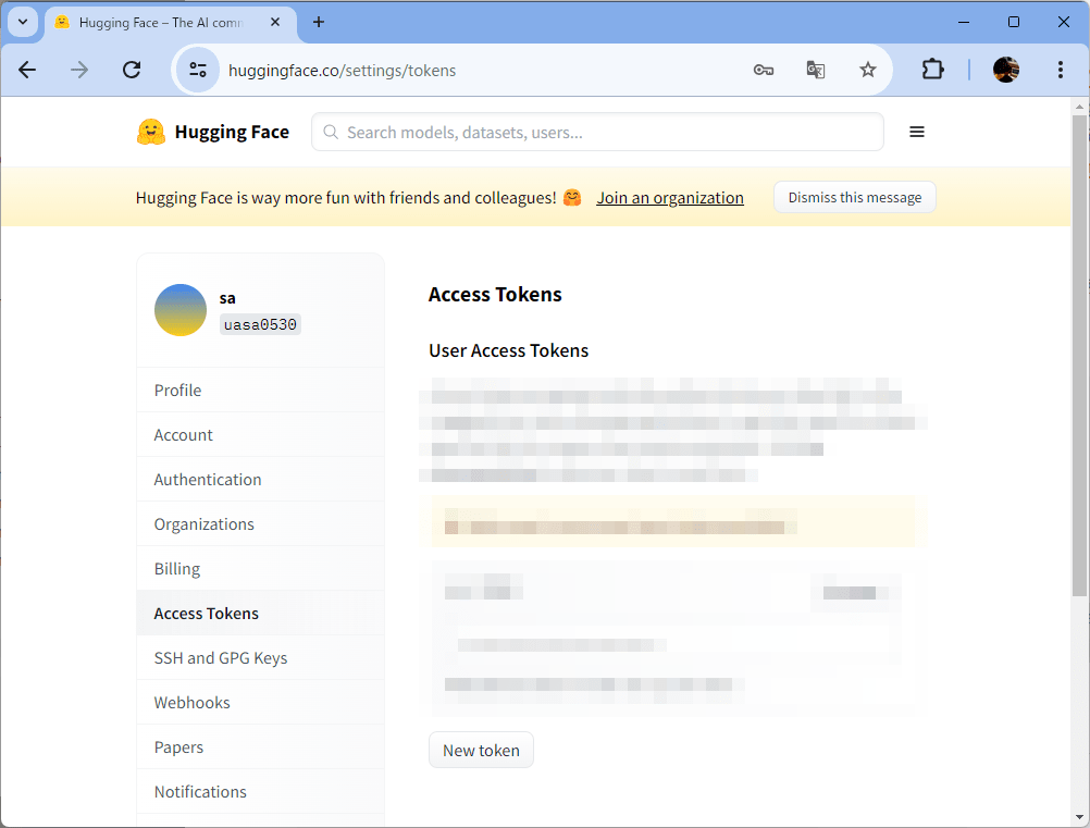Hugging Faceからtokenを使って、ログインします。tokenは、Hugging Faceの[Settings]-[Access Token]から取得できます。