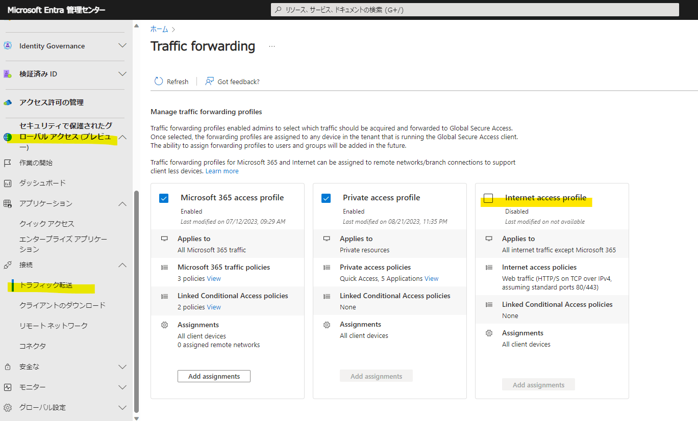 Microsoft Entra 管理センターの [セキュリティで保護されたグローバル アクセス (プレビュー)] > [接続] > [トラフィック転送] で [Internet access profile] のチェックを ON にします。