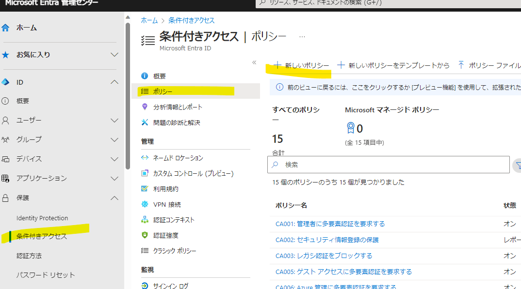 [保護] > [条件付きアクセス] > [ポリシー] > [+新しいポリシー] から新規ポリシーを作成します。