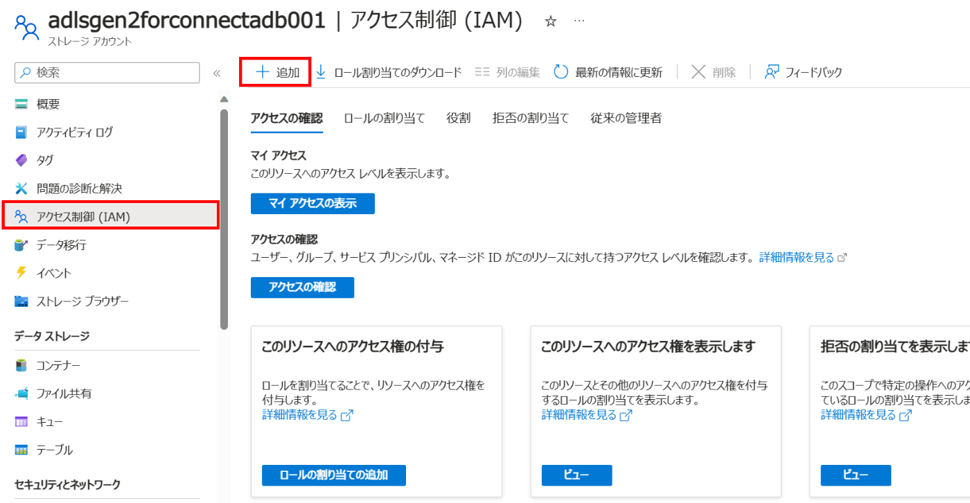 事前に作成したストレージアカウントに移動します。[アクセス制御(IAM)] -> [+追加] -> [ロールの割り当ての追加] の順にクリックし、ADLS Gen2 にサービスプリンシパルからのアクセスを許可するロールを割り当てます。