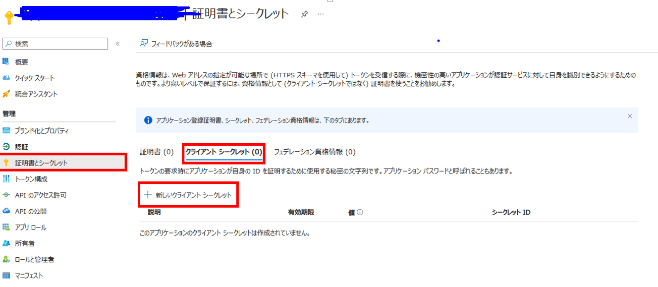 左のブレードで[証明書とシークレット]をクリックし、[クライアントシークレット]タブの[新しいクライアントシークレット]をクリックして進みます。