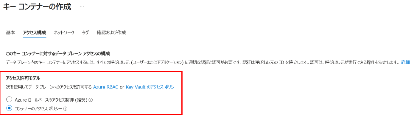 Azure Key Vault を作成する際、アクセス構成のページでアクセス許可モデルをコンテナーのアクセスポリシーとしています。手順の中でサービスプリンシパルにアクセス権を付与する形とします。