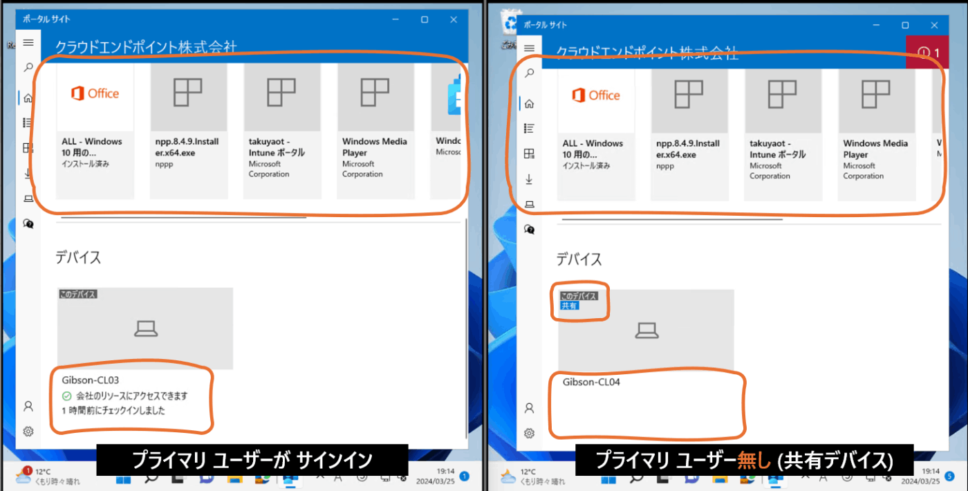 Intune にて「プライマリ ユーザー」として表示されているユーザーと、実際の使用ユーザー (サインインしてるユーザー) がズレた場合の動作です。