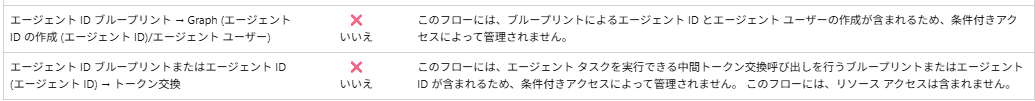 条件付きアクセスの対象となるのは、Agent ID または Agent ユーザー が何らかのリソースにアクセスした際に開始される トークン取得フロー のみです。