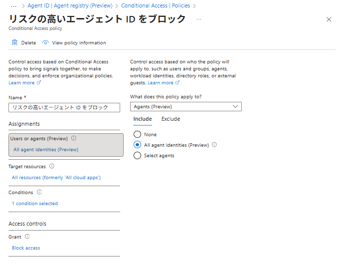 以下は、リスクが高いと判定された Agent ID をブロックする 条件付きアクセス ポリシーの一例です。
