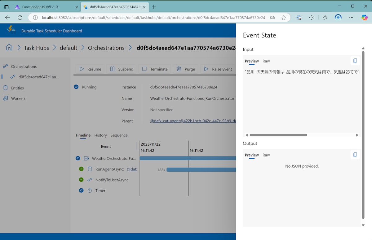 Durable Task Scheduler のダッシュボードを確認するとオーケストレーション インスタンスが実行されていることがわかります。NotifyToUserAsync アクティビティ関数も呼ばれていることがわかります。