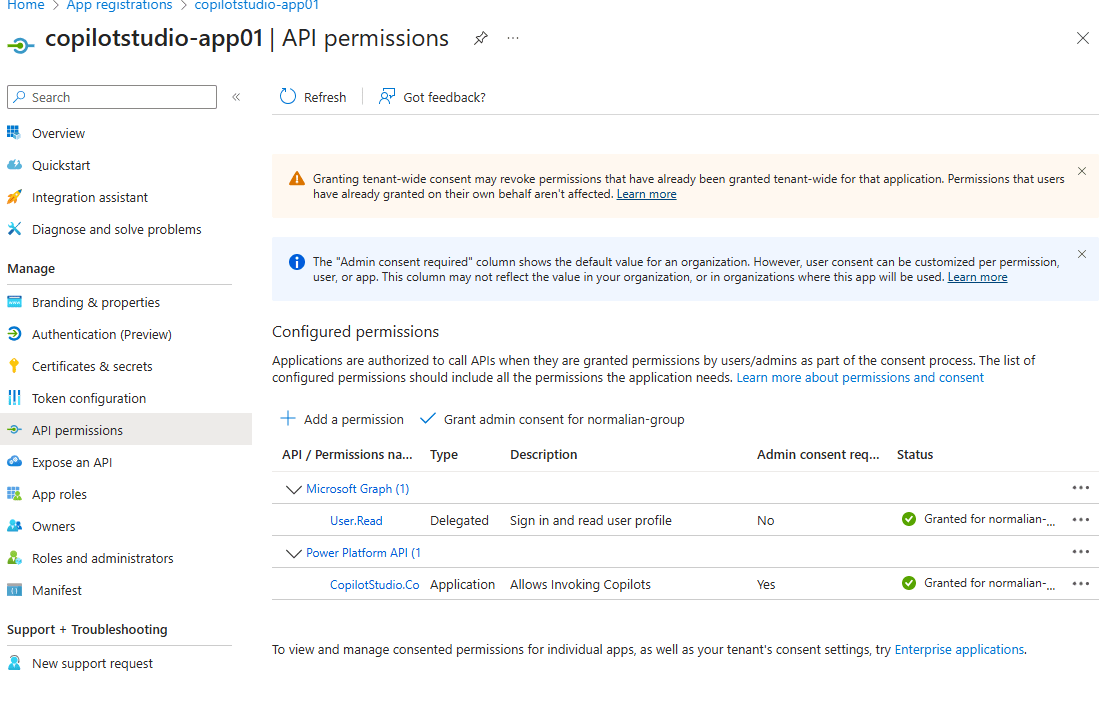 - Entra ID 側に app registration を新規に作成し、CopilotStudio.Copilot.Invoke API Application Permission を割り当てる