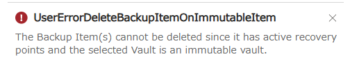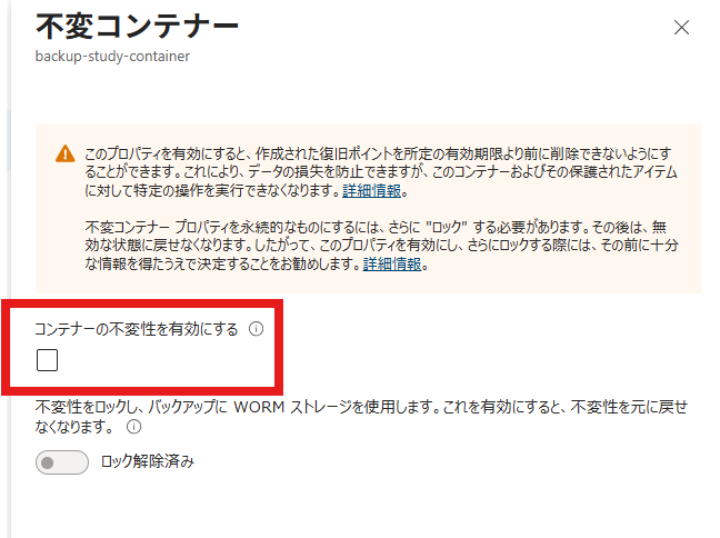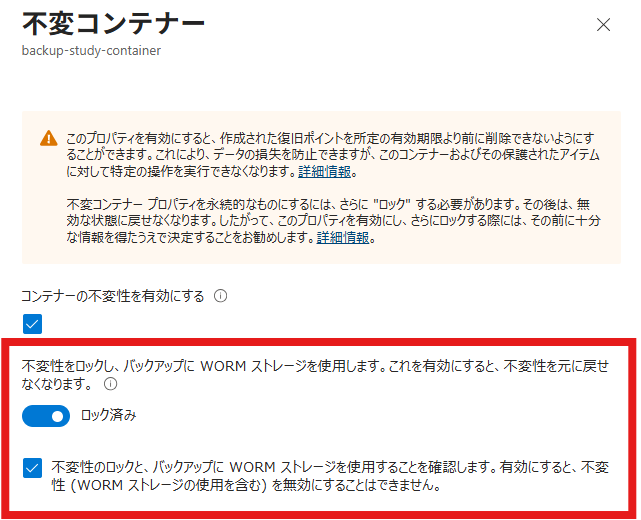 WORM ストレージが有効な不変性があり、バックアップが失われる可能性のある操作は許可されない。さらに、設定がロックとなるため無効に戻すことが不可