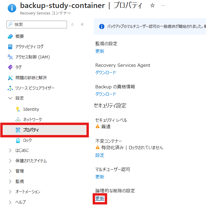 Recovery Services コンテナーの[設定]→[プロパティ]→[論理的な削除の設定]の更新をクリック
