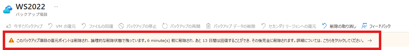 復旧ポイントが論理的な削除状態であるメッセージが表示されます