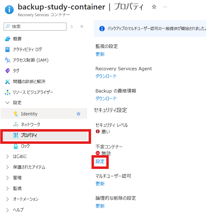 - Recovery Services コンテナーの[設定]→[プロパティ]→[不変コンテナー]の設定をクリック