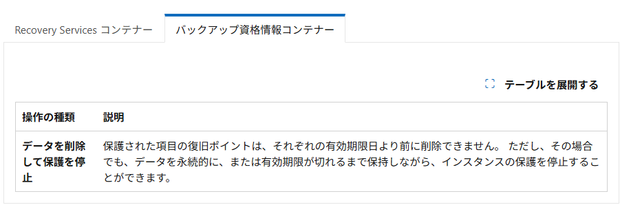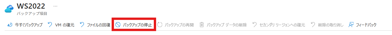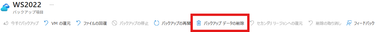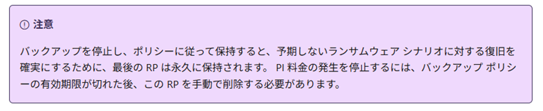 バックアップ停止後も、最後の復元ポイントは保持期間終了まで残りますので、バックアップ データをすぐに削除し、以降のバックアップにかかる課金をすぐにゼロにすることはできなくなります。