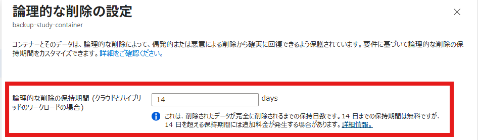 コンテナー化されたバックアップに対する既定の論理的な削除期間である 14 日間は保持コストがかかりません。しかし、保持期間を 14 日以上に設定した場合は 15 日目からのバックアップに関して通常のバックアップ料金が加算されます。14 日に関しては直近の 14 日が適用されます。