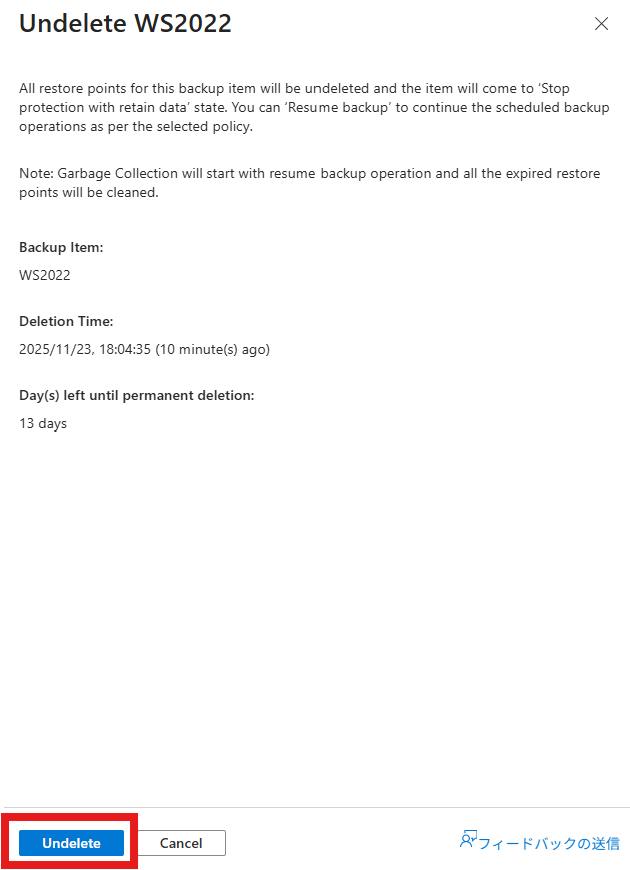 削除後 (データが論理的に削除された状態にある間)、削除されたデータの回復が必要になった場合は、削除を取り消すことができます。 これにより、データの状態を保持して保護を停止するデータが返されます。